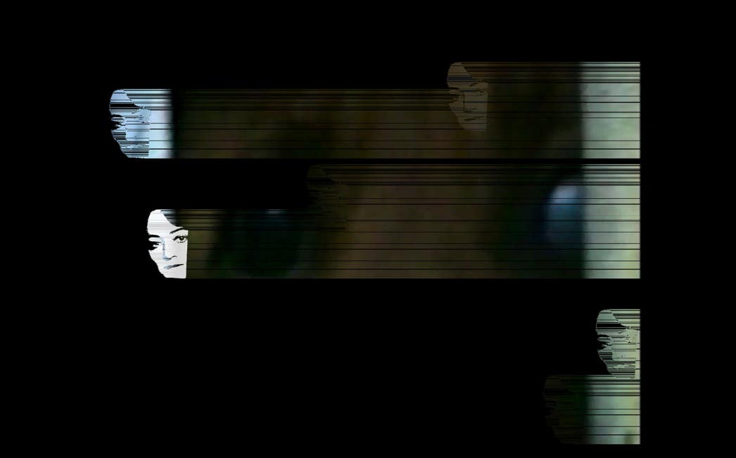 ... not just your face. A once graphic work. Now, in the darkness of the double projection, faces cut back to stencils hover around passing webs of lines - and behind oversized flickering barcodes, silently barking dogs.