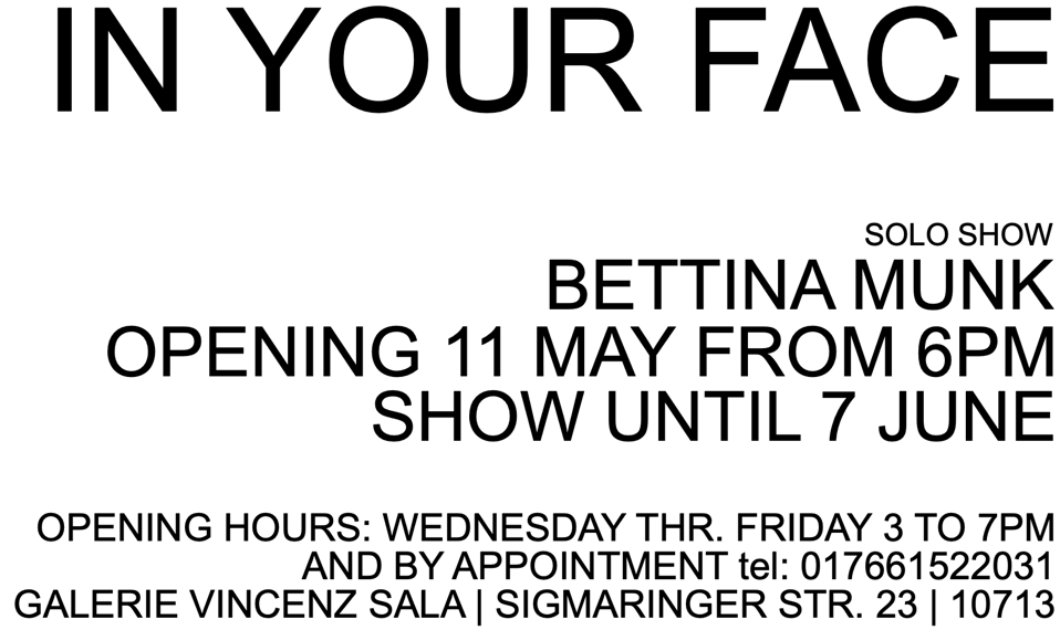 ‚in your face‘ (and not just the face) handelt von der durchbrochenen Gewohnheit, vom Aufprall, der nicht nur den Türknauf auf eine aleatorisch unabschließbare Durchdringlichkeit überführt. Ein Zusichkommen, dem das Selbst abhanden kommt.