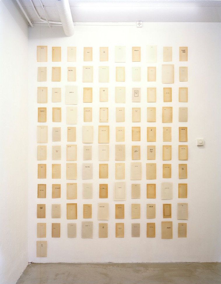 101 torn out book pages, 202 pins, 187 × 260.5 cm/73.6 × 102.6 inches, paper size varying from 10.2 × 17.7 cm/4 × 7 inches to 15.2 × 23.4 cm/6 × 9.2 inches.
