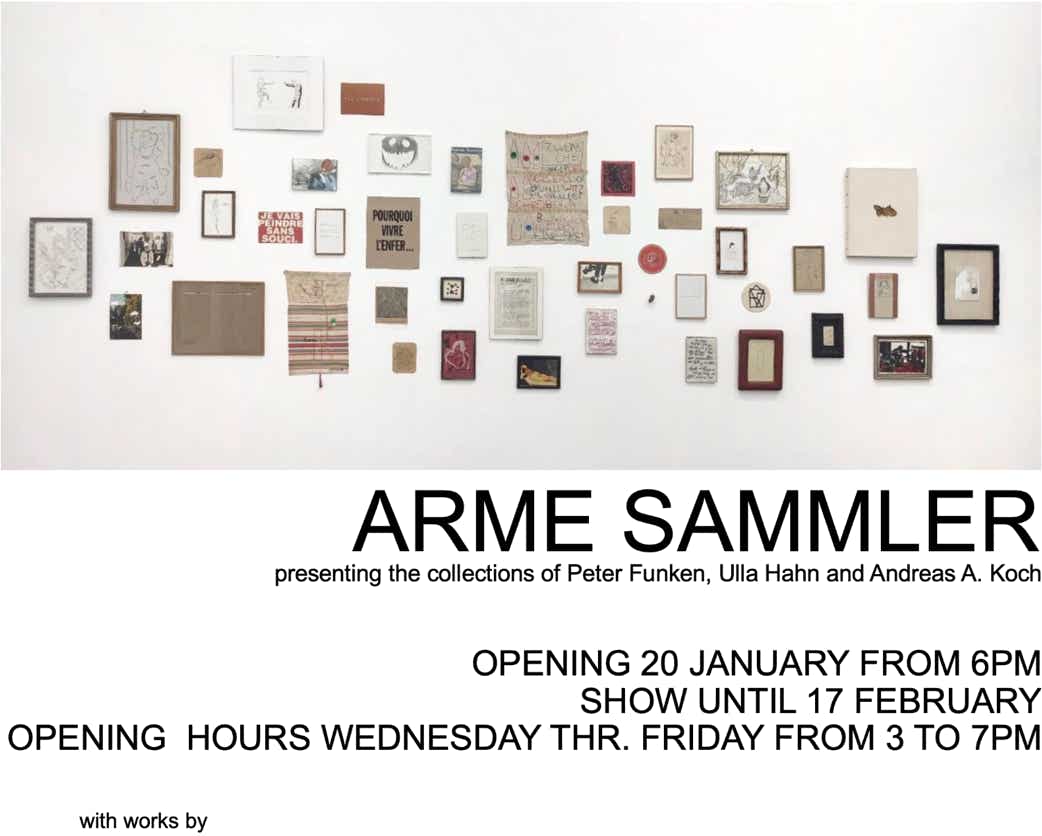 Demnach gibt es keine „Arme Sammler“, aber es gibt sie doch und so zeigten Peter Funken und Andreas A. Koch seit 2016 ihre als „Armensammlungen“ bezeichneten Kollektionen in einer Wanderausstellung an fünf Orten: Zuerst in Bremen (Kubo), dann im „Weltecho“, Chemnitz, der „Kunsthalle Kühlungsborn“, dem „Kunstverein Ruhr“ in Essen und schließlich im Sommer 2018 im „Atelierhof Kreuzberg“ in Berlin. Und nun noch einmal in der Galerie Vincenz Sala und zusammen mit der Sammlerin Ulla Hahn, die die Initialzündung für die Neuauflage von „Arme Sammler“ gab. Sie sprach Funken/Koch an und ist diesmal mit von der Partie, denn sie zeigt Arbeiten aus ihrer Sammlung belgischer Kunst. Waren Arme-Sammler-Ausstellungen bisher ein Mix von Bildern, Grafiken, Objekten und Fotos, die Funken/Koch so präsentierten, wie es „am besten“ aussah, so ist es diesmal bei Vincenz Sala etwas anders, denn die Sammler/in teilen die drei Wände der Galerie auf, so dass nun fein getrennt und doch in Nachbarschaft zu sehen ist Kunst aus Belgien (Slg. Hahn) zusammen mit Kunst von Frauen mit Frauen (Slg. Funken) und einem Präsentationskonzept, das große und kleine Arbeiten aus der Sammlung Koch vorstellt.