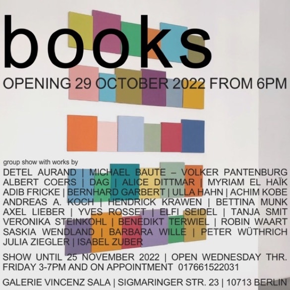 From a curatorial point of view, there is not much more to say about 'books' than the exhibition title already says. Though, our interest in the subject has a long and rich history. With 'books', it culminates in the presentation of a wide range of most diverse artistic approaches to the book as object, medium and technology. The approach of the opening date has led to one thing in particular: The successive grinding of any remaining programmatic border fortifications. Thus, the show gathers bookworks engaging across all genres and beyond. Rather classical artist's books, sketchbooks and leporellos, some from the late 80s and 90s, are included, but also sculptural, installative and conceptual works, also a book on a movie and the movie on the book and a website: https://adibfricke.com/die-reise/