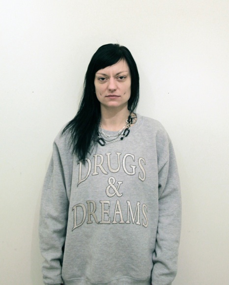 two sweatshirts with digital embroidery (DRUGS&DREAMS) and 44 photographic portraits of artstudents graduating at SVA wearing the sweatshirt.